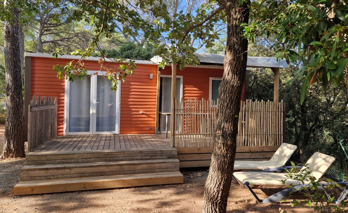 – Half overdekt houten podium terras met tafel, stoelen en 2 ligstoelen