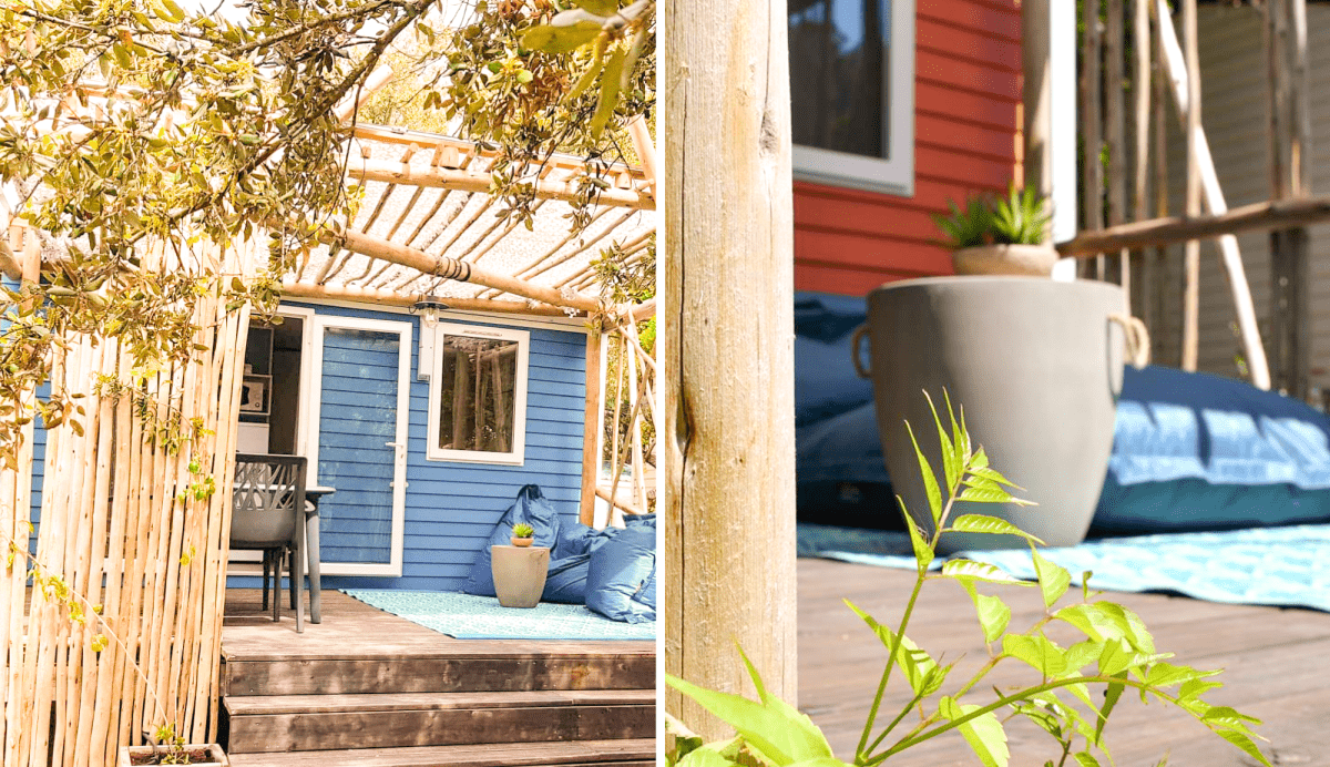 – Modern afgedekt houten terras. 2 tuinstoelen.